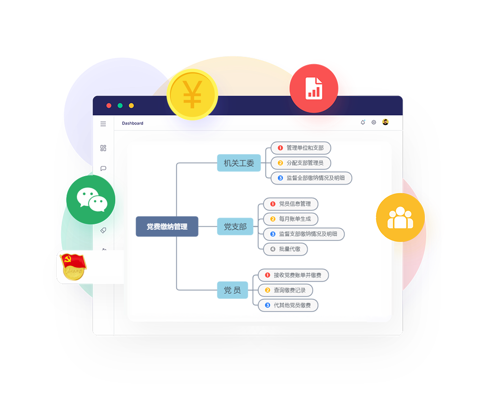 每月账单生成 -> 微信提醒 -> 党员缴费 -> 缴费统计 -> 报表生成。