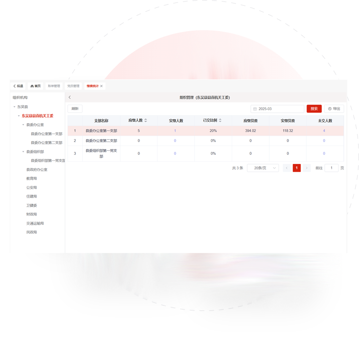 按照部门、支部管理党员信息、党费基数、比例、应缴金额。批量导入。