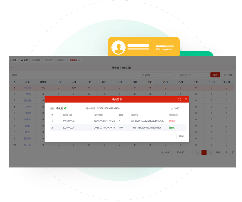 各支部缴纳情况统计、已缴/未缴党员明细,导出报表